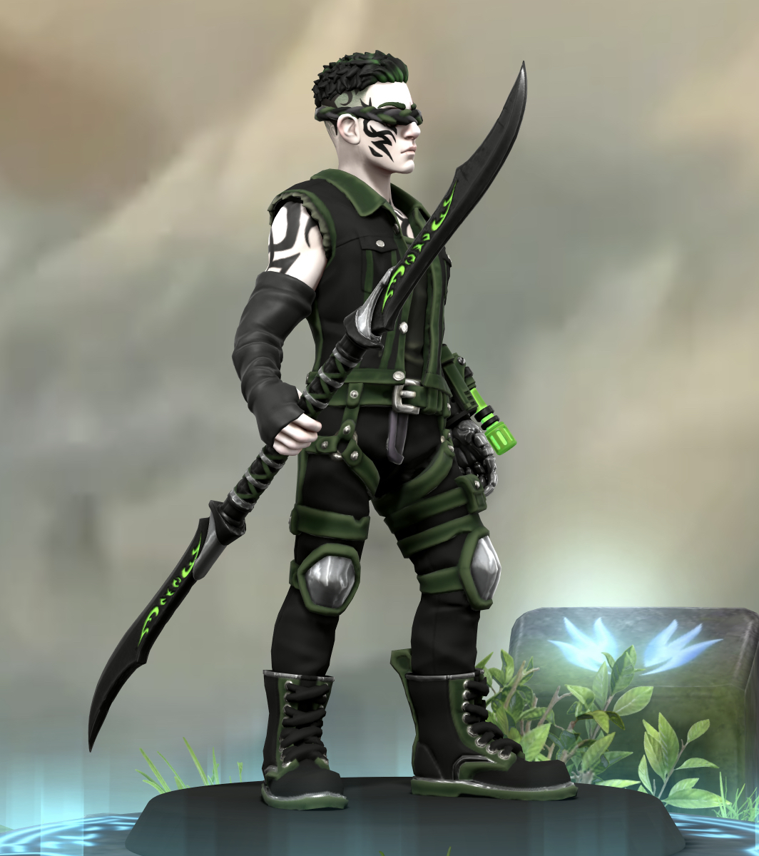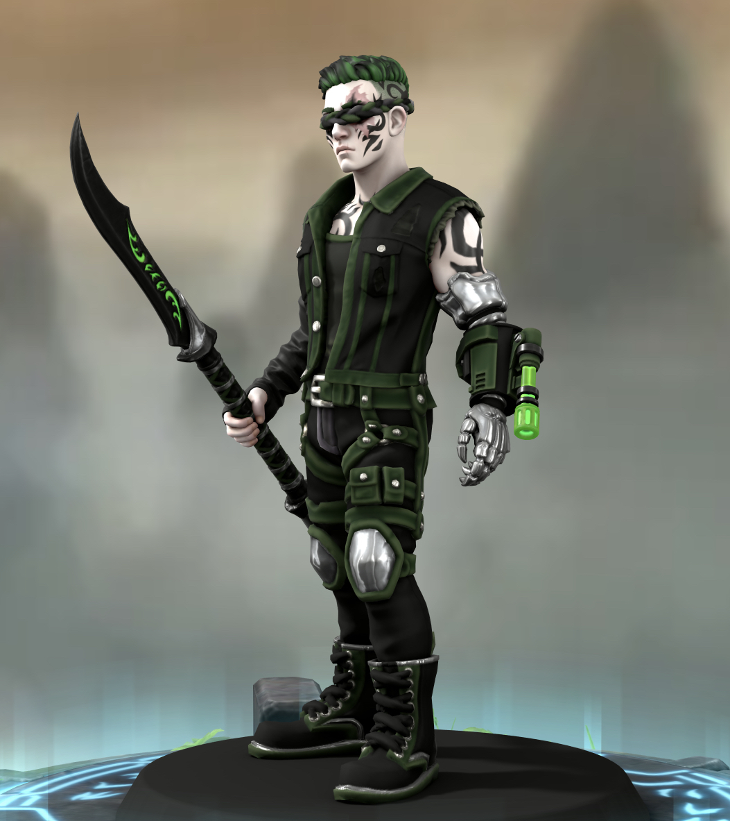 VISUAL: Refs here and here. He's 5'10, has a lean athletic build, stark black tattoos against pale skin, and green/black hair. His eyes (or lack thereof) are horribly scarred and marred so are always covered up by either a blindfold or some sort of sunglasses, but the scarring extends past this onto his forehead on the left side.